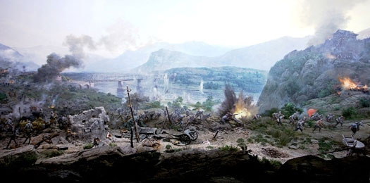 百團(tuán)大戰(zhàn)半景畫(huà)館位于八路軍抗戰(zhàn)史陳列館東面,以半景畫(huà)的形式,運(yùn)用聲、光、電等手段,全景式逼真再現(xiàn)了八路軍百團(tuán)大戰(zhàn)的恢宏氣勢(shì)與壯烈情景。由400平方米油畫(huà)、480平方米仿真實(shí)景構(gòu)成,生動(dòng)展現(xiàn)了攻克娘子關(guān)的戰(zhàn)斗場(chǎng)景。畫(huà)面高10米×弧長(zhǎng)36.6 米,突出表現(xiàn)娘子關(guān)戰(zhàn)斗的典型場(chǎng)面;仿真實(shí)景475.2平方米,作為繪畫(huà)部分延伸,共同構(gòu)成一個(gè)圍合空間,產(chǎn)生了良好的遠(yuǎn)...